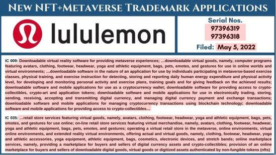 5月11日消息,据美国律师Mike Kondoudis的推文,Lululemon已为其品牌名和LOGO提交元宇宙及NFT相关商标申请,涵盖NFT、加密交易、元宇宙零售店、元宇宙运动课、虚拟服装等范围。