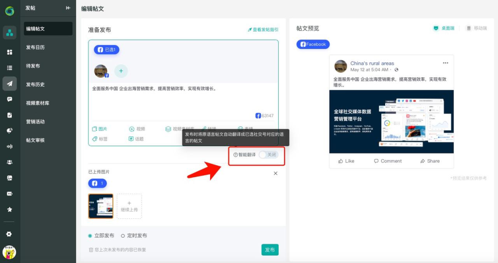 另外发布的海外的社交帖文有一个很大的痛点是需要英文。以前我们的小伙伴发布英文的营销内容,需要先把文案内容在其他平台翻译成其它的语言,再把翻译完成的语言复制粘贴到发布框中。OneSight营销云则提供了另外一个强大的功能,可直接对帖文进行翻译,将发布的时候的原语言自动翻译对应的已选账号语言,让我们的营销小伙伴只需要关注内容本身。