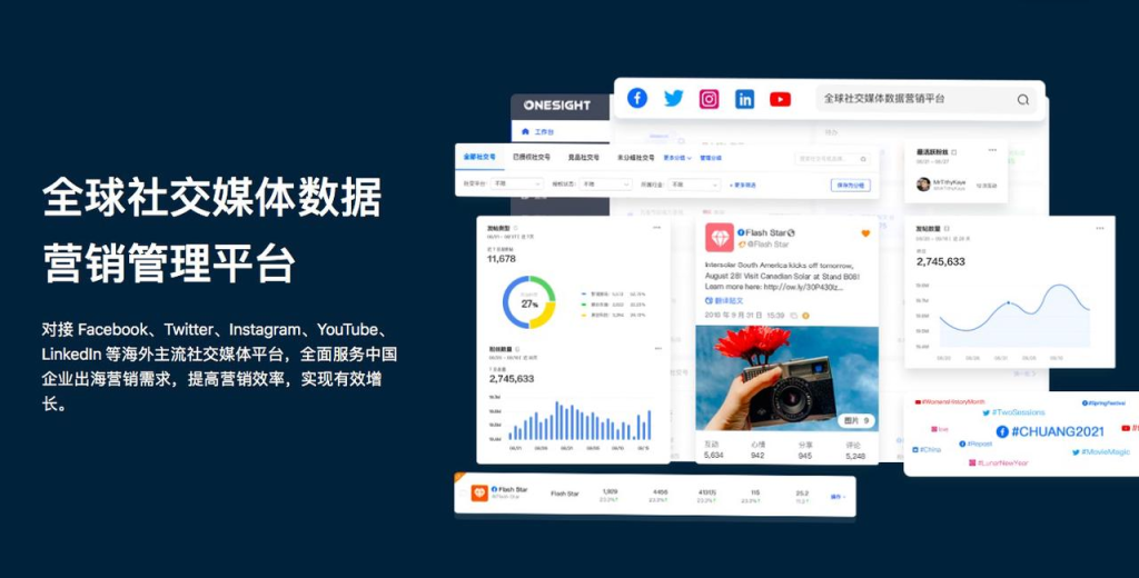 这款Facebook一键发帖工具就是OneSight营销云,OneSight营销云的定位是全球媒体数据营销管理平台,OneSight营销云不仅提供Facebook一键发帖功能,也提供对各海外社交平台的整体营销效果分析,对营销内容的和用户行为分析的精细化运营报告。