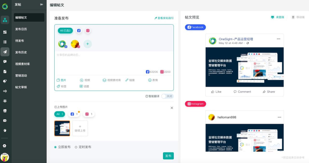 OneSight营销云提供了发帖、监控、互动、舆情监测等各类功能,其中的“发帖”工具提供了快捷的Facebook一键发帖功能,以及支持Facebook、Twitter、Instagram、LinkedIn等平台。